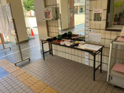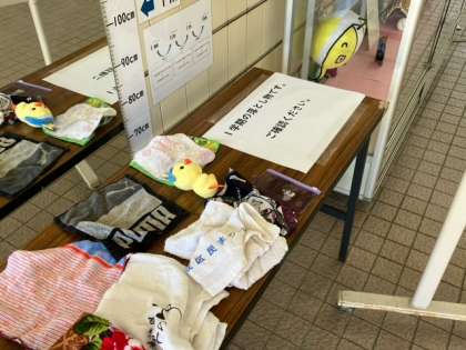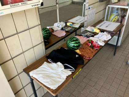 玄関に落とし物を展示しています。懇談時にでも、お持ち帰り下さい。