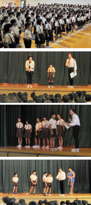 校長先生から、夏休みの水泳大会や陸上大会に参加した児童に、賞状やメダルの伝達がありました。