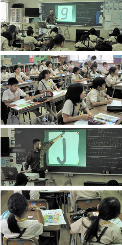 写真は五年生の授業風景です。基本のアルファベットを発音を交えながらていねいに教えていただきました。児童もみんな、授業に集中していました。