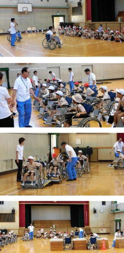 友だちを乗せて、介助の方法や段差やスロープでの操作など、参加児童全員がしっかりと学習しました。