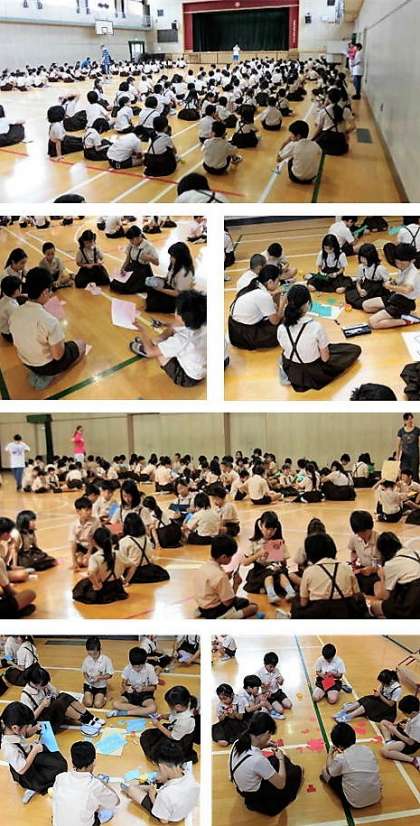 今朝の「天茶っ子集会」では、平和を誓うパネルづくりを行いました。