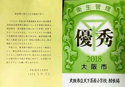 大阪市長から本校給食調理室に優秀標が授与されました。