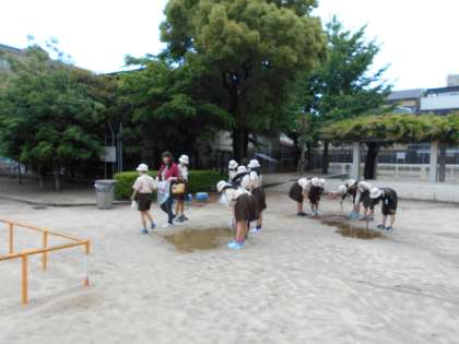 今週は6年1組が、いつも遊んでいる学校前の「北天下茶屋公園」とその周囲を掃除しました。雨上がりなので、あまりごみはありませんでしたが、きれいになった公園はとても気持ちがいいです。