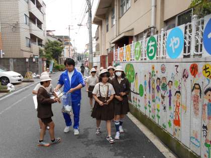 天下茶屋小学校では、保護者の方々と協力して「おはよう運動」及び「公園清掃」に取り組んでいます。