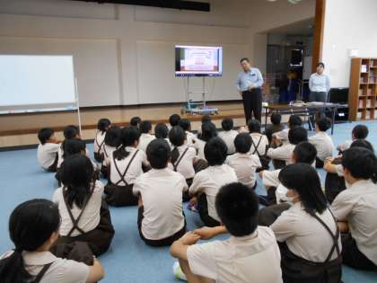 6年生は、少年係の方から「SNSで被害に遭う人が増えていること」「インターネットに画像や動画をアップロードすると削除することは不可能であること」を再現DVDを通して教えていただきました。