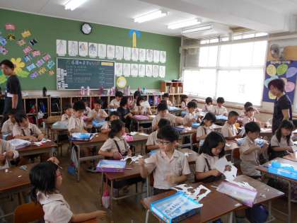 2年生は図工です。注意深くはさみを動かし、細かな形を切り出しました。切り取った部品を黒の色画用紙の上で、組み合わせながら、お話をつくっていきました。どんな作品ができあがるか楽しみです。