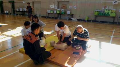 来週19日から始める水泳指導を前に、西成消防署の方から胸骨圧迫による救命処置やAEDを使用した心肺蘇生の手順を学びました。実際にダミー人形と訓練用AEDを使って万が一の事態に備える訓練を行いました。