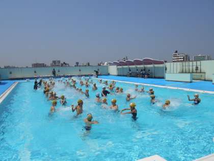 1年生は大きなプールに初めて入り、水遊びをしています。