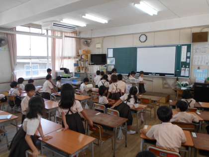 始業式後に各クラスに戻り、夏休みの宿題を提出します。久しぶりに友だちとあえてとてもうれしかったです。1年、2年、3年(その1)のようすです。