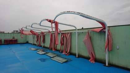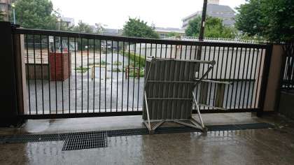 天下茶屋小学校では、プールに設置している日よけテントがすべて破れてしまいました。また、アルミ製の朝礼台が通用門まで飛ばされました。