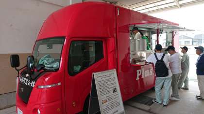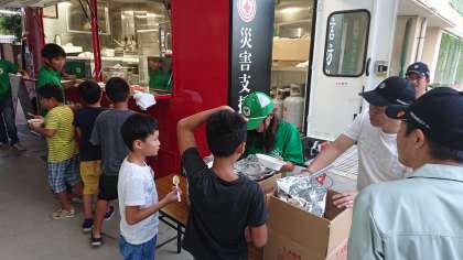 テント設営の後は、夕食のカレーライスづくりです。七輪の炭をあおいで飯ごうでご飯を炊きました。今年度はお隣の飛田連合町会のみなさんにご協力いただき、永信防災組合の「キッチンカー」でカレーを炊きだしていただきました。あまりのおいしさにおかわりの列が絶えることがありませんでした。