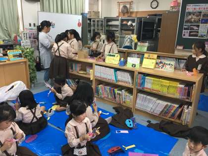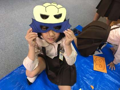 図書館ボランティアのみなさんが先生になって、紙工作の本にあるハロウィンのマスクをつくるワークショップを行いました。本を見るだけではわからなかったことも、ボランティアの方の一言で、スッと理解できて形にすることができました。