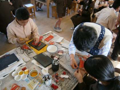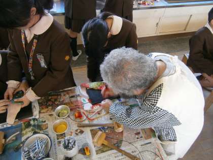 地域の生涯学習レザークラフト教室の人に講師として来てもらい、皮のペンケース作りを行いました。