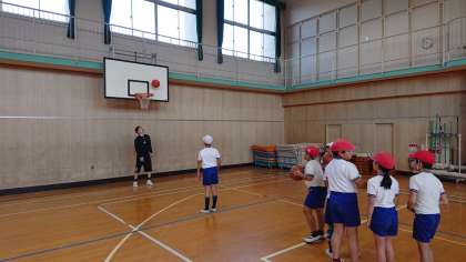 プロバスケットチームのエベッサ大阪から2名の選手に来ていただき、4〜6年生がドリブルやシュートの練習方法を教えてもらいました。最後には小学生6〜7名 VS 選手2名でゲームを行いました。プロの動きに感動した1時間でした。ありがとうございました。