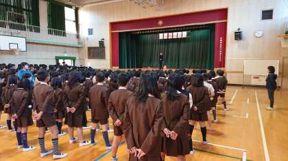始業式では、校歌を斉唱した後、校長先生から「一年の計は元旦にあり」というお話がありました。自分が決めた目標をクリアするために、努力を続けてほしいと話されました。