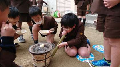 3年生は社会科で「くらしのうつりかわり」を学習しています。ガスやIHヒーターがなかったころはどのようにして、調理をしていたのかを体験するために、七輪を使っておもちを焼くことに挑戦しました。炭に火をつけることに苦労しましたが、おいしくおもちを焼くことができました。
