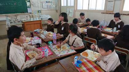 6年生が1〜5年生の各クラスに分かれて、それぞれのクラスの人たちといっしょに給食を食べました。写真は6年生を迎えた1−1、2−1のようすです。
