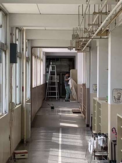 この暑い中で、廊下の壁の塗装を塗り直してもらっています。