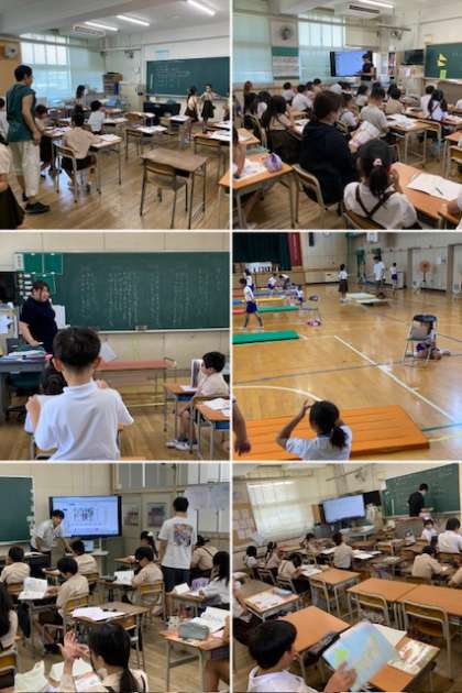 4年生の体育では、開脚前転をタブレットで録画しながら自分のフォームを確認しています。