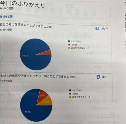 本日のふりかえりを行うと、「自分の考えを伝えることができましたか?」は、94.7%でしたが、「友達の意見や考えをしっかりと聞くことができましたか?」は、78.9%でした。同じぐらいになれば良いのですが、人の意見を聞き、自分の意見と比べることができるようになってほしいです。