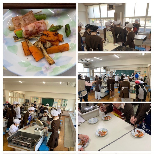 2・3時間目に家庭科の学習で、野菜のベーコン巻きを作りました。味付けもほどよく、子どもたちは「おいしい」と味わって食べていました。