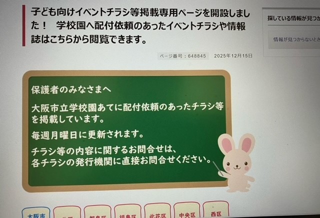 イベント等のチラシについては、以前大阪市教育委員会のホームページに掲載されていると通知いたしました。