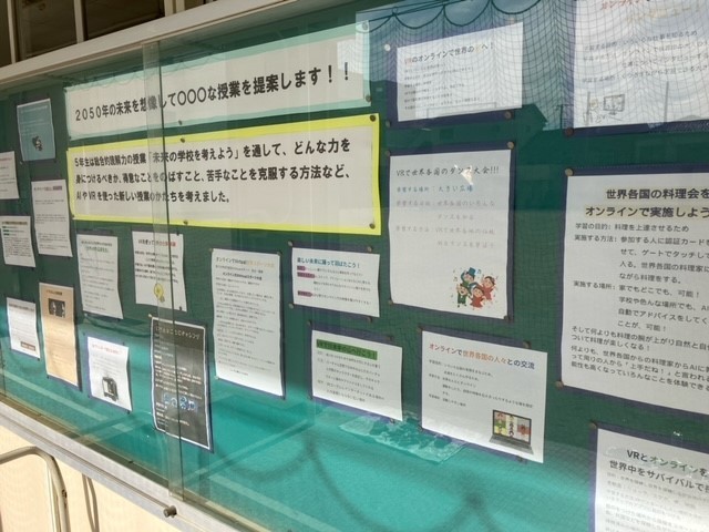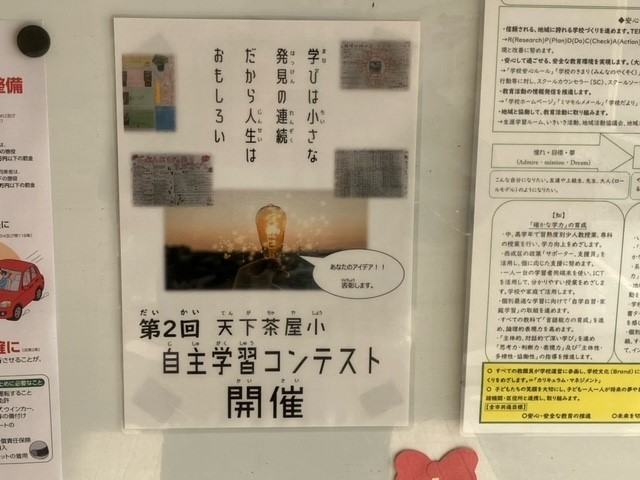 写真は、「総合的読解力」のまとめの校内掲示・まとめの児童向け通信・「自主学習」コンテストのチラシです。
