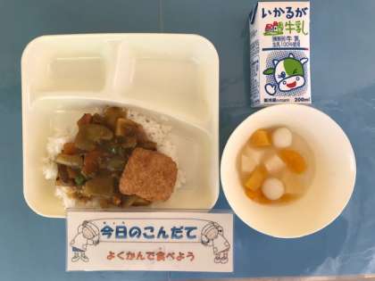 4月9日(火)の献立は「カツカレーライス・フルーツ白玉・牛乳」でした。
