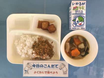 4月18日(木)の献立は「鶏肉とじゃがいもの煮もの・あつあげのしょうゆだれかけ・紅ざけそぼろ・ごはん・牛乳」でした。
