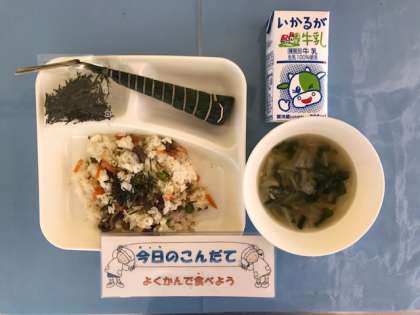 5月8日(水)は、子どもの日の行事献立の「牛肉のちらしずし・すまし汁・ちまき・牛乳」でした。