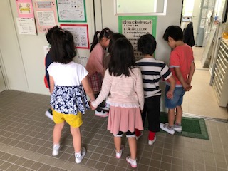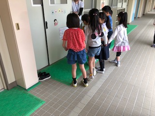 2年生が1年生を招待して、学校探検をしました。学校には、自分たちの教室以外にもいろいろな部屋があります。2年生と1年生でチームを作り、2年生がリーダーとなって校内を歩き回りました。「この部屋は、管理作業員室だよ」「理科室では、いろんな実験をするよ」、・・・。