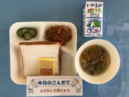 5月13日(月)の献立は「じゃがいものミートグラタン・スープ・きゅうりのピクルス・食パン・アプリコットジャム・牛乳」でした。