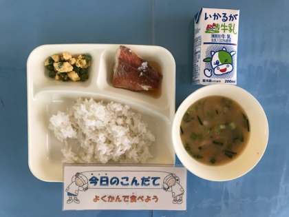 赤魚は骨も少なく食べやすい魚です。「この魚、骨がないね!」と教えてくれる子がいました。今が旬の生のえんどう豆を使ったえんどうの卵とじは、春の季節の一品でした。