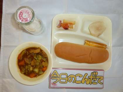 9月3日(水)には、「鶏肉とてぼ豆のカレー煮(米粉)・じゃがいもとトマトの重ね焼き・なし(二十世紀)・コッペパン・はちみつ・牛乳」が出ました。今回は小麦粉を使用していない米粉のカレールウの素を使用し、小麦アレルギーのある児童も食べることができる献立となっていました。それに秋が旬の果物のなし(二十世紀)がデザートとしてついていました。