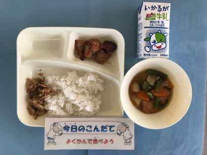 5月17日(金)の献立は「鶏肉のてりやき・じゃがいもとあつあげの煮もの・ごまかかいため・ごはん・牛乳」でした。