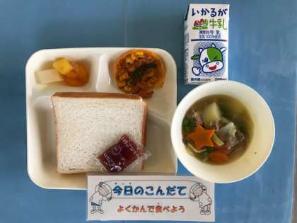 5月20日(月)の献立は「豚肉と野菜のスープ煮・変わりピザ・ミックスフルーツ(缶)・食パン・いちごジャム・牛乳」でした。