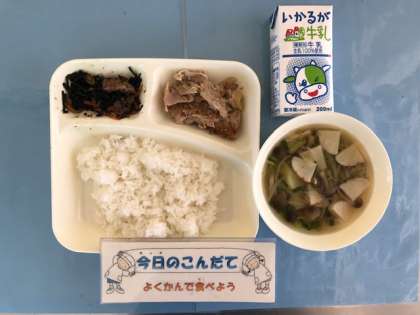 ひじきは、わかめやこんぶと同じ海そうのなかまです。ひじきには、カルシウムや食物繊維などが多く含まれています。しっかりと食べてほしい食材です。今日はひじきのいため煮で登場しました。