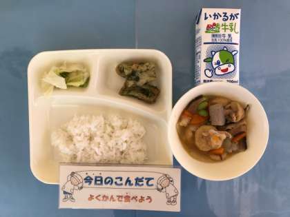 5月24日(金)の献立は「ちくわのいそべあげ・鶏肉と一口がんもの煮もの・あっさりキャベツ・ごはん・牛乳」でした。