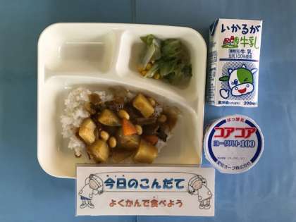 5月28日(火)の献立は「牛肉と大豆のカレーライス・レタスとコーンのサラダ・ヨーグルト・牛乳」でした。