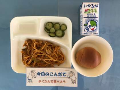 6月3日(月)の献立は「スパゲッティミートソース・きゅうりのバジル風味サラダ・1/2黒糖コッペパン・牛乳」でした。