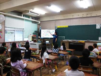 金曜日の1時間目が始まる前の時間、岸里(K)イングリッシュ(E)タイム(T)に取り組んでいます。