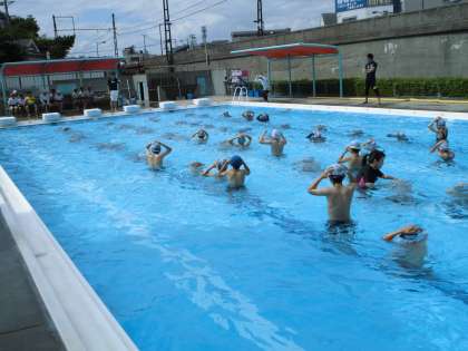5年生も負けていません。音楽に合わせて水慣れや基本の動きを流した後、早速、今の泳力を確かめました。今年の目標を立てて、泳力別の学習に取り組んでいきます。