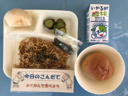 9月3日(火)の献立は「焼きそば・きゅうりの甘酢づけ・なし(二十世紀)・1/2黒糖パン・牛乳」でした。