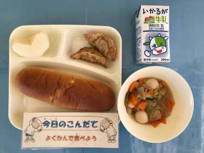 9月10日(火)の献立は「あげぎょうざ・中華煮(うずら卵個別対応)・なし(豊水)・おさつパン・牛乳」でした。