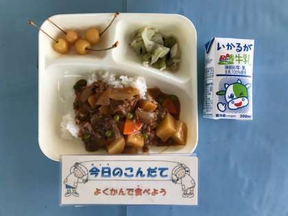 10月21日(月)の献立は「ハヤシライス[米粉]・キャベツのひじきドレッシング・さくらんぼ(缶)・牛乳」でした。