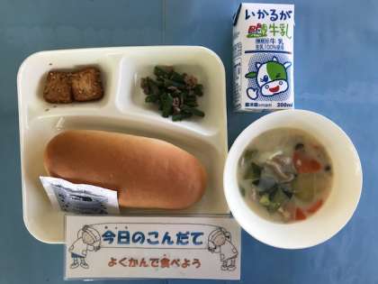 10月23日(水)の献立は「はくさいのクリーム煮・あつあげのごまじょうゆかけ・豚肉と三度豆のオイスターソースいため・コッペパン・ブルーベリージャム・牛乳」でした。