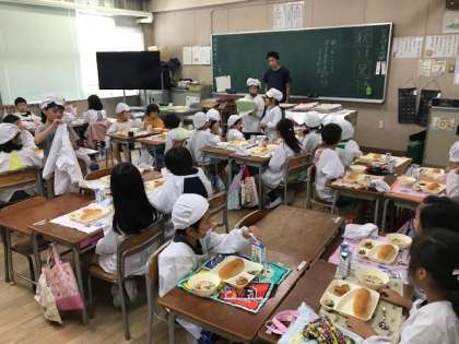 2年生の「いただきます」の前の給食クイズをしている様子です。