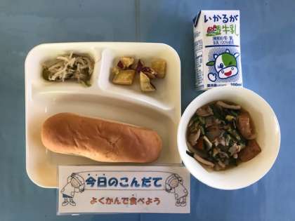 10月28日(月)の献立は「豚肉といかの中華煮・焼きさつまいもの甘みつかけ・もやしとピーマンのいためもの・おさつパン・牛乳」でした。