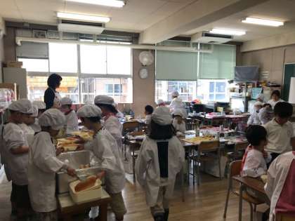2年生の給食準備の様子です。自分たちでてきぱきと用意をしていました。