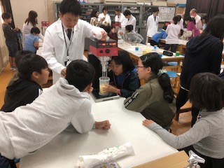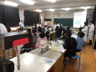 プライミクス株式会社の皆様、早朝よりたくさんの機材等をご用意いただき、ありがとうございました。白衣姿のたくさんの方に囲まれ、子どもたちはいつもと違った雰囲気での学習となりました。